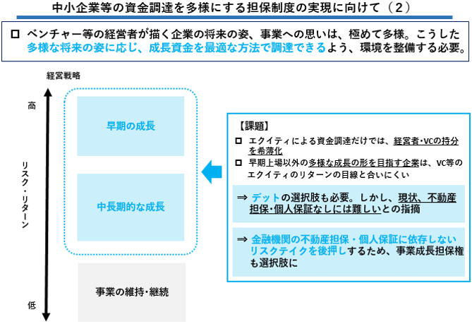 金融庁では、企業・経済の持続的な成長に貢献する観点から、金融機関が、それぞれの企業の経営者が描く多様な成長のあり方やニーズに、金融機能の発揮を通じて応えやすくなるよう、様々な取組みを進めてきました。昨今は、特に、コロナ後を見据えた中小企業等の事業再生や事業承継の促進、ベンチャー企業への資金供給等の観点から、不動産担保や個人保証に依らない、多様な資金調達の環境整備が喫緊の課題となっています。