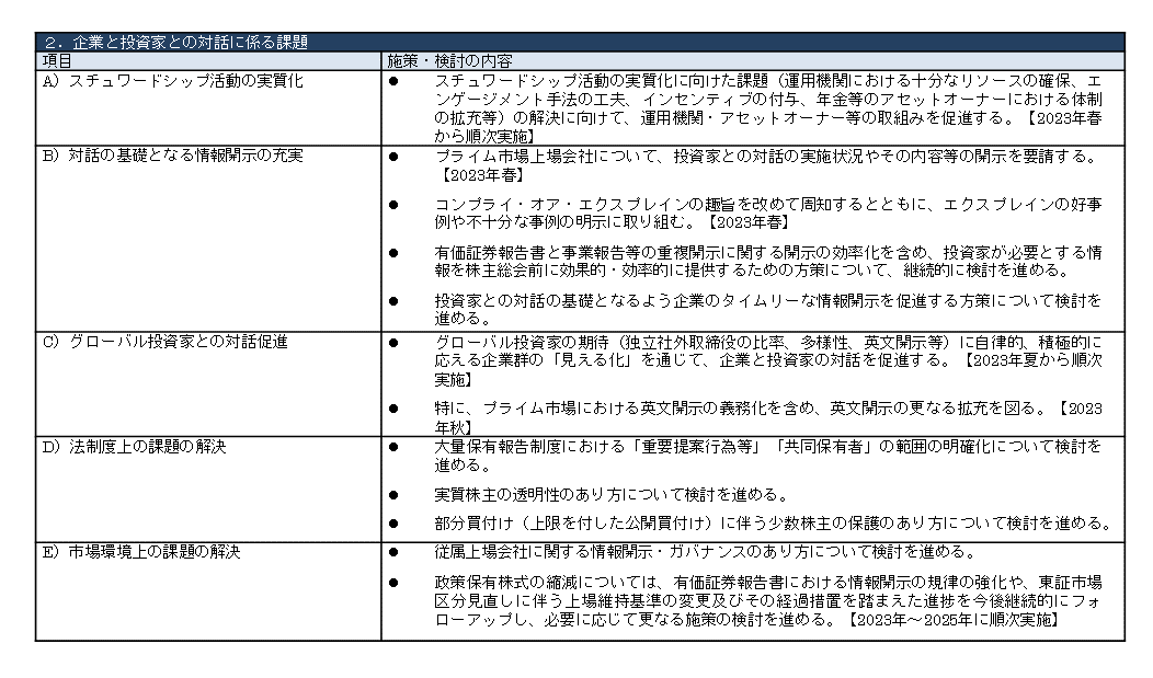 このため、これらの課題については、企業と投資家との建設的な対話や、企業と投資家の自律的な意識改革の促進を通じて、個別企業ごとの課題が深掘りされることで、実情を踏まえた実効的な解決策が検討されていくことが望ましいと考えられます。