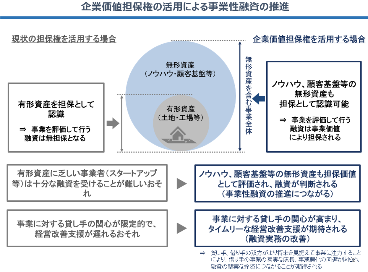 立法の過程では、「銀行が事業全体を担保に取るということは、事業が倒産した時に普通の労働者や取引先が困るのではないか」といったご懸念や、また、企業価値担保権の実行の仕組みを説明することで、逆に「これでは事業性融資推進法案ではなく、回収法案ではないか」といったご懸念もいただきました。しかし、こうしたご懸念には誤解もあるように思います。そもそもこの法律は、担保を使うための法律ではなく、担保を使わないようにするために事前に金融機関が企業に働きかけることを促すための法律なのです。具体的なケースを考えると、例えば学生が資産はないが事業計画はしっかりしているようなIT会社を立ち上げ、お金を借りたいが、銀行は「担保がない」「個人保証がない」として貸してくれない、という状況があるとします。もし、ビジネスモデルをきちんと評価して融資できる人がいれば、スタートアップは資金を手に入れて成長することができるはずです。この企業がいくらの価値を有しているかは、まさにその事業がどれだけのキャッシュフローを生み出せるかにかかっています。事業そのものが担保になれば、事業が好調であればその価値は高まりますし、不調であれば担保価値は低下します。銀行にとっても貸出金の回収可能性を高めるために、借り手の事業を能動的に支援するインセンティブがあると考えられます。かつての銀行の場合、不動産さえ担保にとっておけば万が一のときにはその不動産を処分して回収すればよかったため、ひどい場合は貸したら後は放置というケースもゼロではありませんでした。そういう意味では、金融機関の行動や当局の対応など、法律に書かれていない部分での対応も極めて重要であり、そういった部分も含めて説明しないとかえって誤解を招いてしまいます。