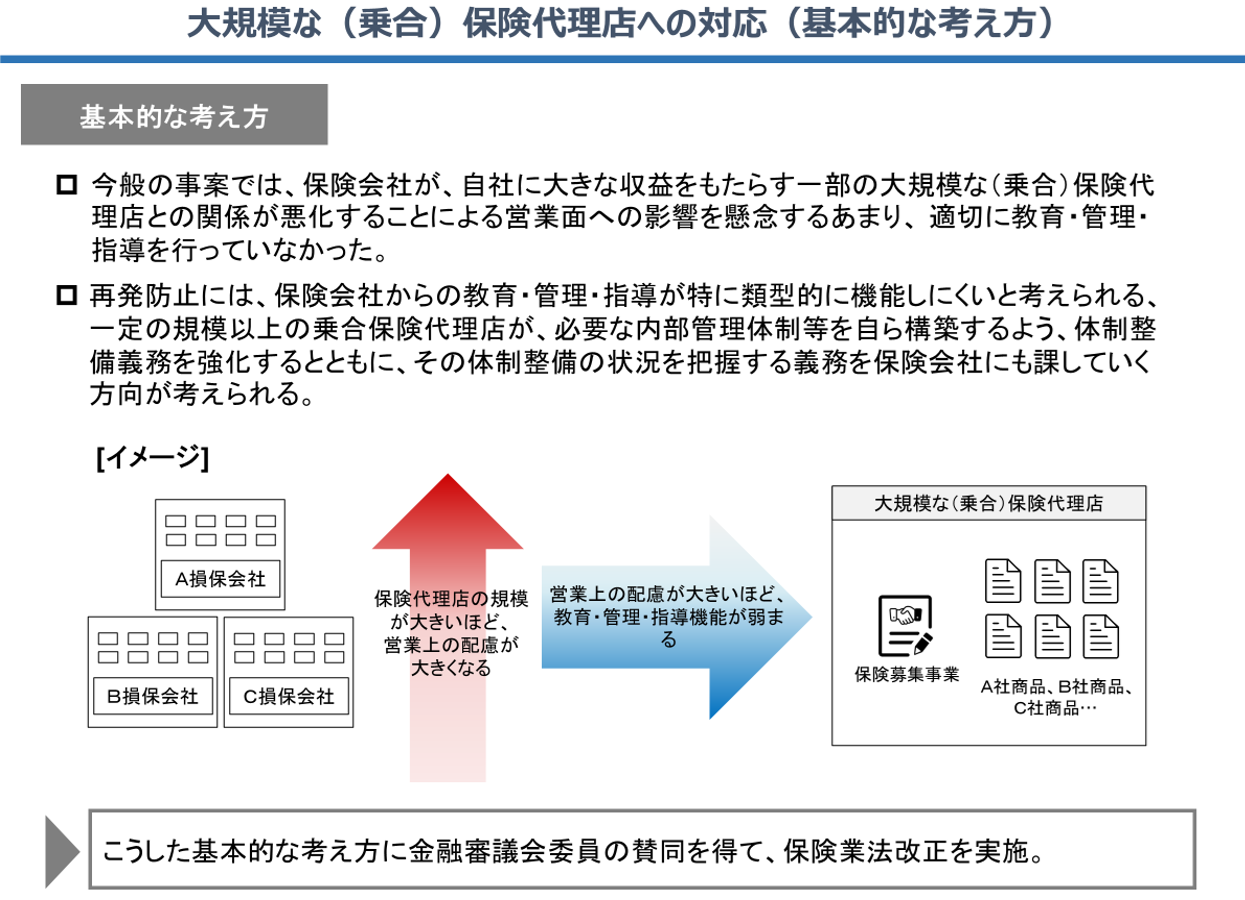 そうですね。従来の保険業法が想定していたのは、「保険会社が強い立場にあるので、保険会社の代理として販売を行っている代理店は、保険会社の指示に従って業務を行うはずだ。したがって、保険会社が保険代理店を管理・指導するという枠組みが有効に機能する。」という前提でした。このもとでは、代理店に対する直接的な規制はさほど必要なく、保険会社からの管理・指導を通じた規制をすれば良いはずでした。しかし、ビッグモーターのような大規模代理店の力が強くなり、むしろ保険会社をコントロールできるような力関係になってしまいました。つまり、法律が前提としていた力関係が逆転してしまっていたということです。中小規模の代理店であれば、引き続き保険会社の管理・指導に従ってくれると思うのですが、ビッグモーターの事案では多くの顧客と直接の関係を持ちたくさんの保険を販売している実績を逆手にとって、体制整備を疎かにしたり、保険会社側に様々な便宜を図ってもらおうとしたりした結果、不祥事が起きてしまったのです。そのようなことが今後起きないよう、保険業法を含めた一連の制度を改正する必要がありました。こうしたことから、金融審議会「損害保険業等に関する制度等ワーキング・グループ」の中では、大規模な(乗合)保険代理店に対し、ワーキング・グループの事務局としてこうした方向性で検討してはどうか、という「基本的な考え方」を委員の先生方に示しながら議論を進めていきました。最終的にはこうした方向性に賛同が得られ、今回の保険業法改正の基礎とすることができたことが嬉しかったです。実はこの改正には損保会社における独占禁止法違反の事案(カルテル事案)を踏まえた対応も含まれているのですが、また別の機会にさせていただきます。
