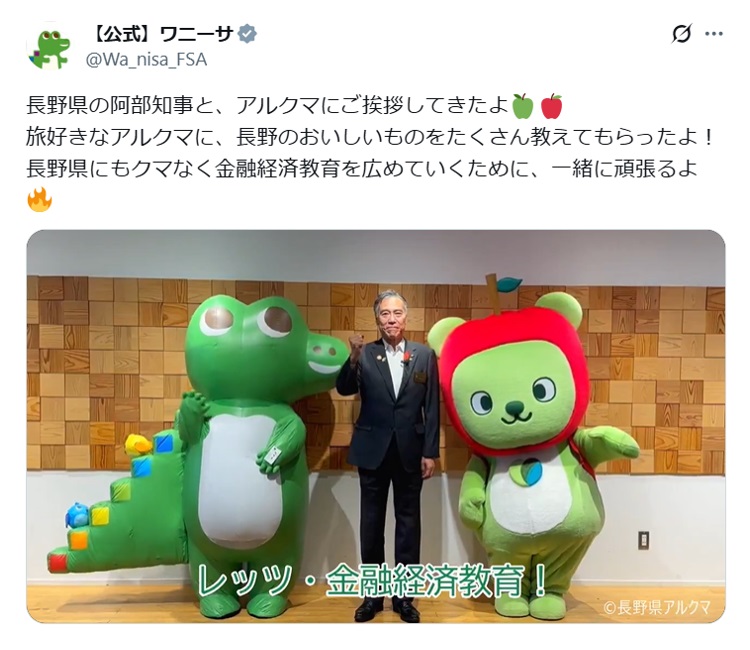 金融庁は金融経済教育の推進に取り組んでいます。金融経済教育を全国各地へ広めていくため、地域の財務局や地方公共団体、金融機関、事業会社等と連携しながら、金融庁公式キャラクター「ワニーサ」による全国キャラバンを各地で展開しております。