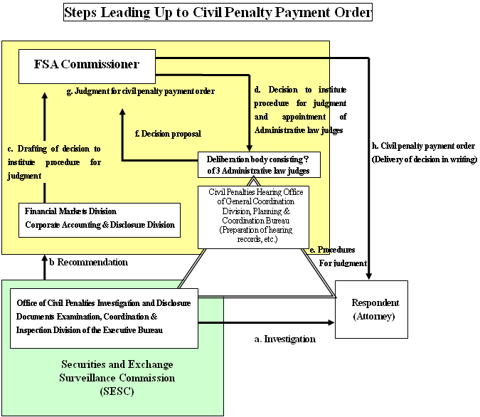 The civil penalty payment order is designed to be issued after an administrative hearing (procedures for judgment) in order to carefully implement the new penalty system. As a general rule, the procedures for judgment take place with open doors based on a deliberation body consisting of three Administrative law judges. Anyone who has been involved in the investigation of the case is not allowed to take charge of the case as an Administrative law judge. In addition, there are provisions to ensure fairness and impartiality in the procedures for judgment: for example, various powers in the procedures for judgment (such as making decisions on the hearing of opinions and examination of evidence) are stipulated as powers unique to Administrative law judges. It should be noted that in the procedures for judgment, the party subject to the civil penalty payment order (respondent) or his/her attorney can appear on the hearing date to state his/her opinions and petition for the examination of various types of evidence (examples: questioning of unsworn witnesses (so-called ''witnesses'' in judicial trials), expert opinions, submission of documentary and/or material evidence). (However, no hearing will be held if the respondent submits a plea accepting the facts of the violation and the amount of the civil penalty as stated in the notice of the decision to institute procedures for judgment prior to the date of the first hearing). On the other hand, officials designated by the FSA Commissioner (designated officials) on the administration side can also participate in the procedures and file for evidence and take other necessary actions in the procedures for judgment. After going through the aforementioned procedures for judgment, Administrative law judges prepare a decision proposal on the case and submit it to the FSA Commissioner, who in turn issues a civil penalty payment order based on the decision proposal if any facts of violations are identified. The Civil Penalties Hearing Office of the General Coordination Division, Planning and Coordination Bureau assists the Administrative law judges on the hearing dates, and performs court-clerk-like duties such as preparing and managing hearing records and ensuring the appearance of respondents and unsworn witnesses. (The Civil Penalties Hearing Office also takes charge of duties associated with the payment and collection of penalties after a judgment has been made for a civil penalty payment order). The FSA is committed to striving to establish a securities market in which everyone--including individual investors--can participate with peace of mind, through the precise implementation of the civil penalty system. |