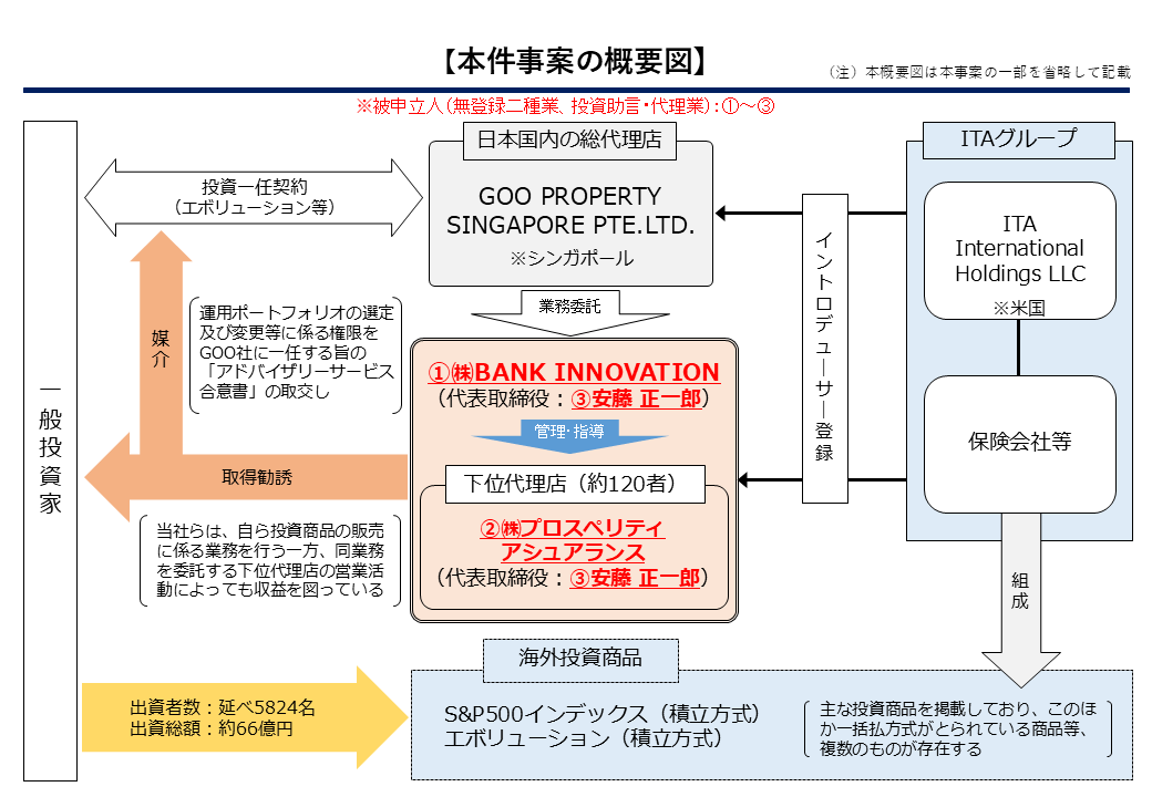 当社らは、金商法第29条所定の登録を受けずに、米国籍の金融持株会社ITA International Holdings LLCを最上位とするITAグループの保険会社等が組成する「S&P500インデックス」及び「エボリューション」等の集団投資スキームの持分(金商法第2条第2項第6号)に該当する海外投資商品に関し、下記(1)のとおり、集団投資スキーム持分の募集又は私募の取扱いを業として行い、また、下記(2)のとおり、顧客とGOO PROPERTY SINGAPORE PTE.LTD.(シンガポール共和国籍、以下「GOO社」という。)との間の投資一任契約の締結の媒介を業として行っている。
