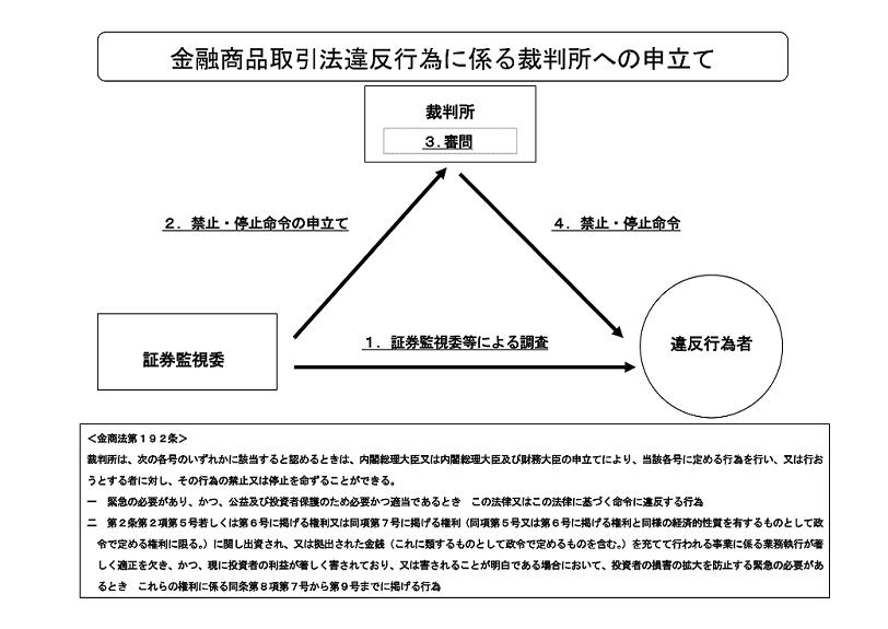 第百九十二条 裁判所は、次の各号のいずれかに該当すると認めるときは、内閣総理大臣又は内閣総理大臣及び財務大臣の申立てにより、当該各号に定める行為を行い、又は行おうとする者に対し、その行為の禁止又は停止を命ずることができる。